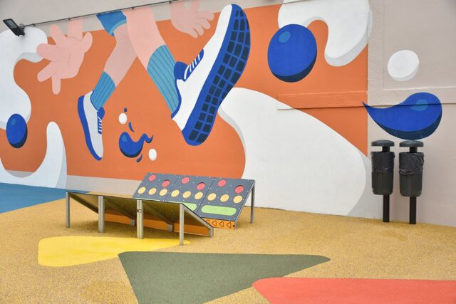 Otro de los cambios visibles tiene que ver con el entorno visual. Sobre las medianeras que rodean el patio se realizaron dos murales temáticos que aportan identidad, color y una nueva estética al lugar.
