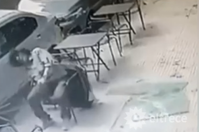 Las imágenes captadas por una cámara de seguridad de un edificio cercano muestran con crudeza el momento exacto en que un blindex se desprende desde varios metros de altura y cae directamente sobre la cabeza del hombre, de 50 años, que se encontraba sentado en una mesa al aire libre.