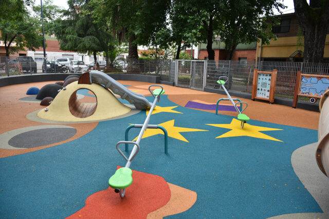 Desde el punto de vista técnico, la obra incorporó solado de caucho EPDM, un material resistente, antideslizante y de bajo mantenimiento, especialmente indicado para áreas de juego infantil. Esta decisión también respondió a criterios de seguridad e higiene.